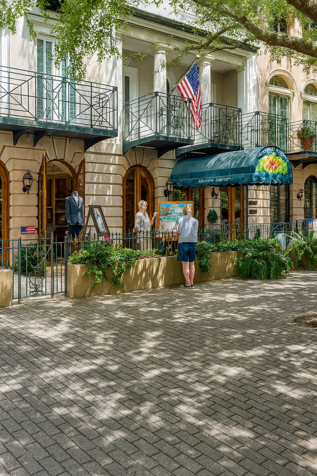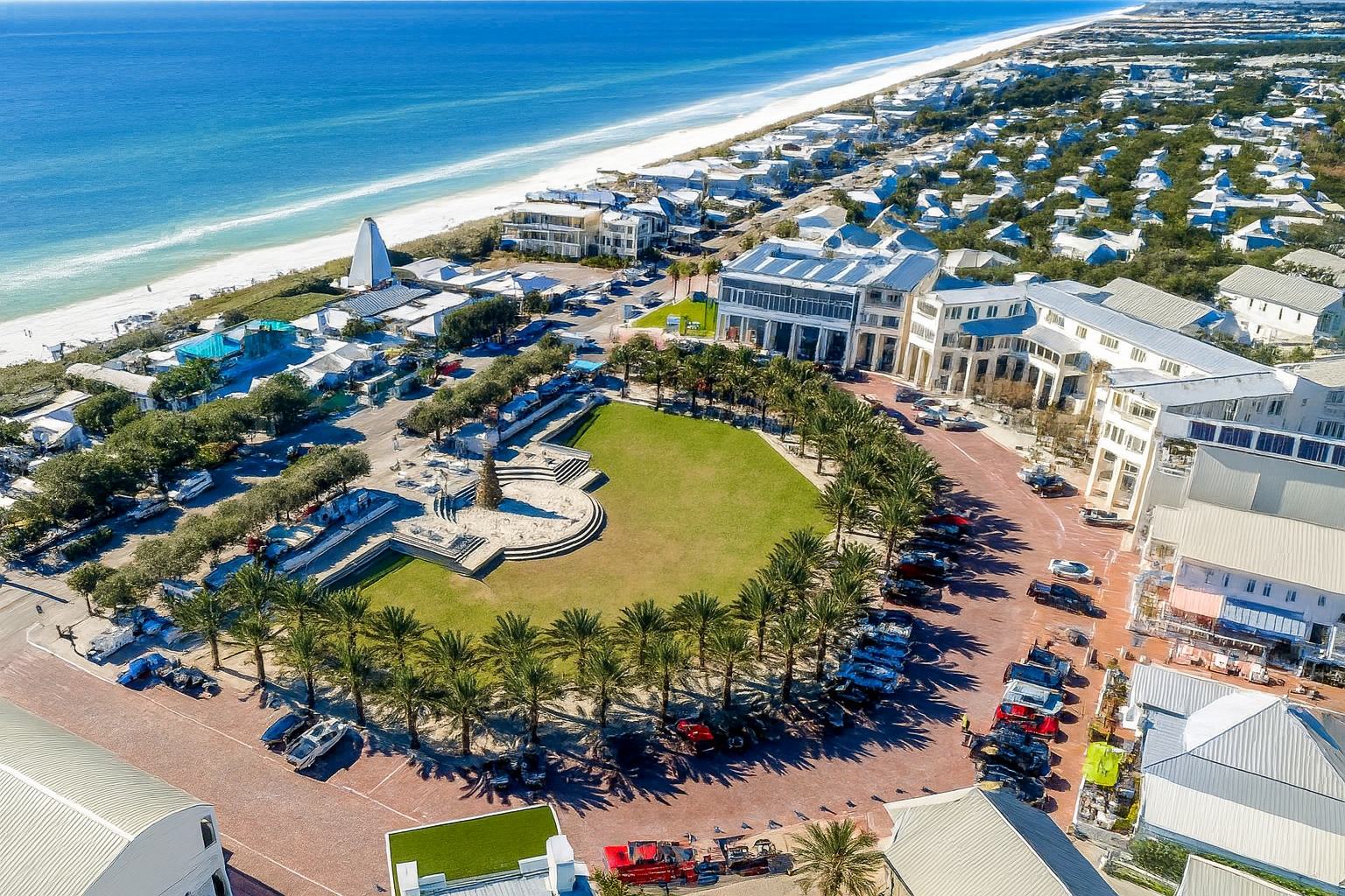 The heart of Seaside, featuring shops, art galleries, and a vibrant farmers' market.